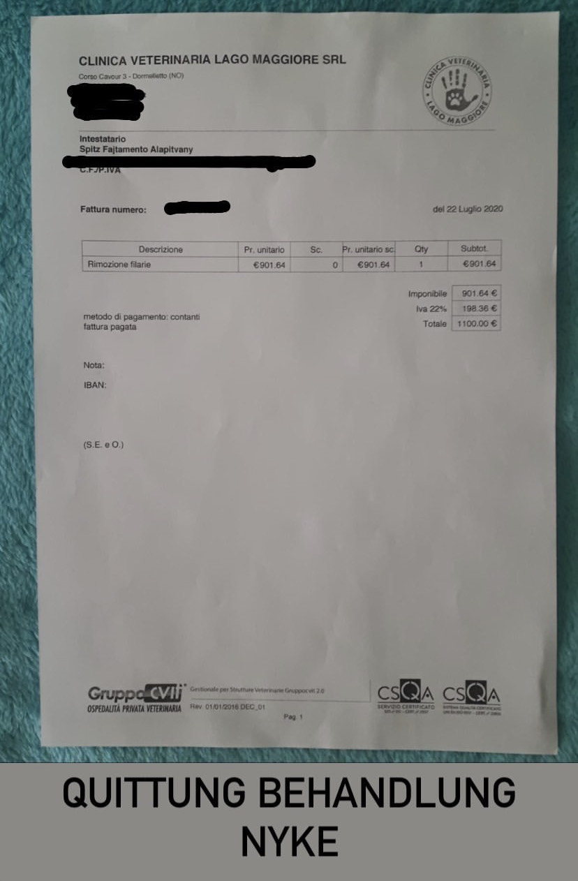 Nyke hat die Reise nach Italien gut überstanden und wurde heute morgen um 9:30Uhr operiert. Es wurden 9 Würmer aus ihrem Körper entfernt. Manche sind vermutlich bereits vor der OP durch die Medikamente abgestorben. Ohne diese OP hätten diese 9 Würmer vielleicht Nyke’s Artherien verstopft. Wir danken dem gesamten Klinikteam der Clinica Veterinaria Lago Maggiore und den treuen Unterstützern der Spitzrettung, welche diese lange Reise von über 1.000km Hin- und morgen dann 1.000km Rückfahrt auf sich genommen haben, um neben 3 anderen Hunden Nyke das Leben zu retten!